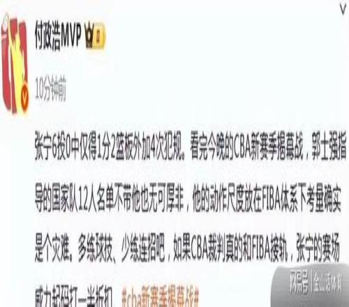 针对张宁在揭幕战的表现,著名媒体人付政浩发文点评:“张宁6投0中仅得1分2篮板外加4次犯规。看完今晚的CBA新赛季揭幕战,郭士强指导的国家队12人名单不带他也无可厚非,他的动作尺度放在FIBA体系下考量确实是个灾难。多练球技、少练连招吧,如果CBA裁判真的和FIBA接轨,张宁的赛场威力起码打一半折扣。”。